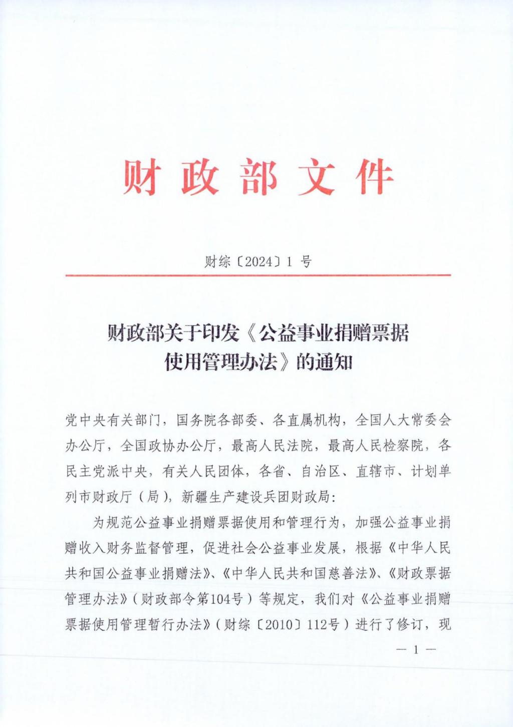 下一篇财综〔2024〕1号 关于印发《公益事业捐赠票据使用管理办法》的通知